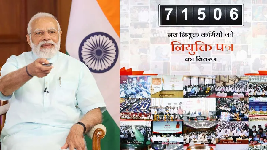 PM નરેન્દ્ર મોદીએ વીડિયો કોન્ફરન્સિંગ દ્વારા રાષ્ટ્રીય રોજગાર મેળાને સંબોધિત કર્યો હતો. તેમણે વિવિધ સરકારી વિભાગો અને સંસ્થાઓમાં નવા નિમણૂક પામેલાઓને લગભગ 71,000 નિમણૂક પત્રોનું વિતરણ કર્યું. દેશભરમાંથી પસંદ કરાયેલા નવા ભરતીઓ ભારત સરકાર હેઠળ ટ્રેન મેનેજર, સ્ટેશન માસ્ટર, સીનિયર કોમર્શિયલ કમ ટિકિટ ક્લાર્ક, ઇન્સ્પેક્ટર, સબ ઇન્સ્પેક્ટર, કોન્સ્ટેબલ, સ્ટેનોગ્રાફર, જુનિયર એકાઉન્ટન્ટ, પોસ્ટલ આસિસ્ટન્ટ, ઇન્કમ ટેક્સ ઈન્સ્પેક્ટર, ટેક્સ આસિસ્ટન્ટ, સિનિયર ડ્રાફ્ટ્સમેન, જેઈ/સુપરવાઈઝર, આસિસ્ટન્ટ પ્રોફેસર, શિક્ષક, ગ્રંથપાલ, નર્સ, પ્રોબેશનરી ઓફિસર્સ, PA, MTS, અને અન્યો જેવી વિવિધ જગ્યાઓ/પોસ્ટ્સમાં જોડાશે. નવા નિમણૂક પામેલા લોકો વિવિધ સરકારી વિભાગોમાં તમામ નવા નિમણૂકો માટે ઓનલાઈન ઓરિએન્ટેશન કોર્સ, કર્મયોગી પ્રારંભ દ્વારા પોતાની જાતને તાલીમ આપી શકશે. PMના સંબોધન દરમિયાન 45 સ્થળો મેળા સાથે જોડાયેલા હતા.