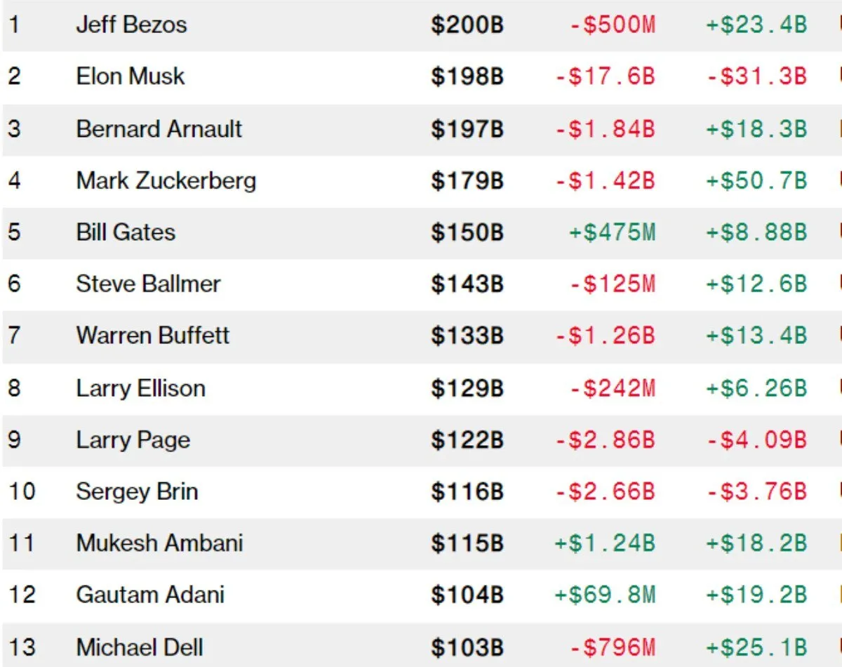 જો આપણે ટોપ-10 બિલિયોનેર્સની યાદીમાં સામેલ અન્ય અબજોપતિઓને જોઈએ તો, બર્નાર્ડ આર્નોલ્ટ 197 બિલિયન ડૉલર સાથે ત્રીજા સૌથી ધનિક વ્યક્તિ છે. ફેસબુકના માર્ક ઝકરબર્ગ 179 બિલિયન ડૉલર સાથે ચોથા સ્થાને છે, જ્યારે બિલ ગેટ્સ 150 બિલિયન ડૉલર સાથે પાંચમા સ્થાને છે. સ્ટીવ બાલ્મર 143 બિલિયન ડૉલરની નેટવર્થ સાથે છઠ્ઠા સૌથી ધનાઢ્ય વ્યક્તિ છે અને વોરેન બફે 133 બિલિયન ડૉલરની નેટવર્થ સાથે સાતમા સૌથી ધનિક વ્યક્તિ છે. પછીનો નંબર લેરી એલિસનનો છે, જે 129 બિલિયન ડૉલર સાથે આઠમાં નંબરે છે. લેરી પેજ 122 બિલિયન ડૉલર સાથે વિશ્વના નવમા સૌથી ધનિક વ્યક્તિ છે, જ્યારે સર્ગેઈ બ્રિનનું નામ 116 બિલિયન ડૉલર સાથે યાદીમાં 10મા સ્થાને આવે છે.