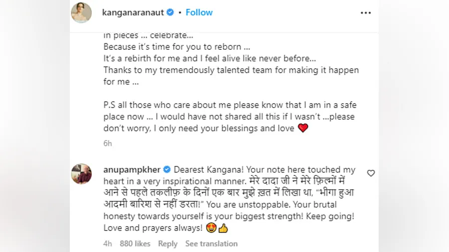 અંતમાં તેણે લખ્યું છે- પીએસ તે બધા લોકો જે મારી પરવા કરે છે, પ્લીઝ જાણી લો કે હું હવે સેફ જગ્યાએ છું.. જો હું નહીં હોતે તો હું આ બધુ શેર ન કરતે.. પ્લીઝ ડોન્ટ વરી, મને માત્ર આશીર્વાદ અને પ્રેમની જરૂર છે. કંગનાની આ પોસ્ટ પર અનુપમ ખેર સહિત ઘણા બધા ફેન્સ અને સિલેબ્સે રિએક્ટ કર્યું છે. અનુપમે ખેરે લખ્યું છે- ડિયરેસ્ટ કગંના, તારી નોટ મારા દિલને ગમી ગઈ છે. મારા દાદાજીએ મારા ફિલ્મોમાં આવવા પહેલાના તકલીફવાળા દિવસોમાં મને એક પત્ર લખ્યો હતો, ભીગા હુઆ આદમી બારીશ સે નહીં ડરતા.. આપ ચલતે રહો.. આપકી ઈમાનદારી હી આપકી સબસે બડી તાકત હૈ, હંમેશા પ્યાર ઓર દુઆ.