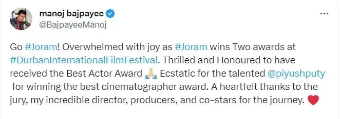 હાલમાં જ 44માં ડરબન ઈન્ટરનેશનલ ફિલ્મ ફેસ્ટિવલનું આયોજન કરવામાં આવ્યું, જેમાં ભારતીય ફિલ્મ જોરમ છવાઈ ગઇ. દેવાશીષ મખીજા દ્વારા નિર્દેશિત આ ફિલ્મમાં મનોજ વાજપેયીએ મુખ્ય ભૂમિકા ભજવી છે. જેના માટે અભિનેતાને બેસ્ટ એક્ટરનો એવોર્ડ મળ્યો છે. તો પીયૂષ પુતિને બેસ્ટ સિનેમેટોગ્રાફીનો એવોર્ડ પ્રાપ્ત થયો છે.
