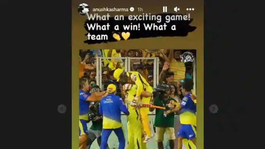 ચેન્નાઈ સુપર કિંગ્સની જીત પર અનુષ્કા શર્માએ પણ રીએક્ટ કર્યું છે. કોહલીની ટીમ રોયલ ચેલેન્જર્સ બેંગ્લોર (RCB) લીગ સ્ટેજથી જ બહાર થઈ ગઈ હતી. અનુષ્કા શર્માનું દિલ રોમાંચક મેચ જોઈને ખુશ થઈ ગયું. તેણે ચેન્નાઈ સુપર કિંગ્સને શાનદાર ટીમ કરાર આપ્યો. તેમણે મંગળવારે ઇન્સ્ટા સ્ટોરી પર ધોનીના રવીન્દ્ર જાડેજાને ખોળામાં ઉઠાવવાની તસવીર શેર કરતા લખ્યું કે, ‘શું રોમાંચક મેચ રહી! શું લાજવાબ જીત હાંસલ કરી! શું શાનદાર ટીમ છે.’ એક્ટ્રેસે તેની સાથે હાર્ટ ઇમોજી પણ લગાવી છે. ચેન્નાઈ સુપર કિંગ્સે સર્વોચ્ચ IPL ટ્રોફી જીતવાની બાબતે મુંબઈ ઇન્ડિયન્સ (MI)ની બરાબરી કરી લીધી છે.
