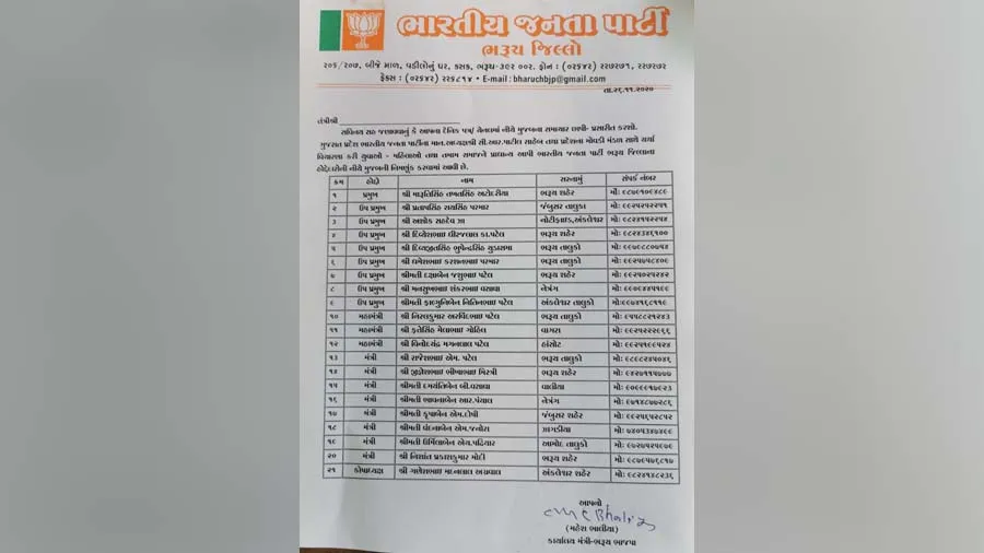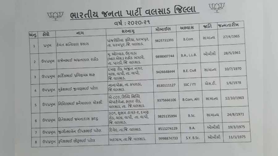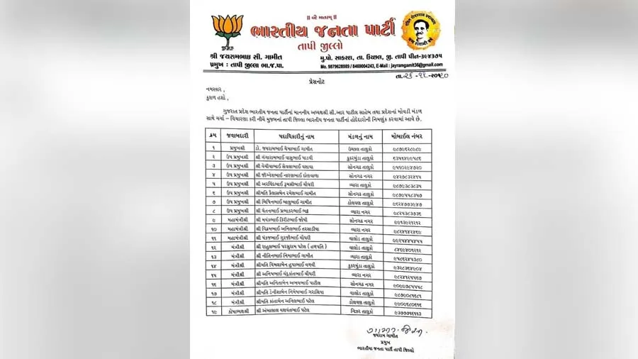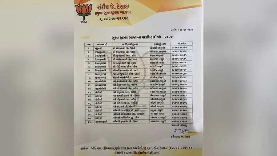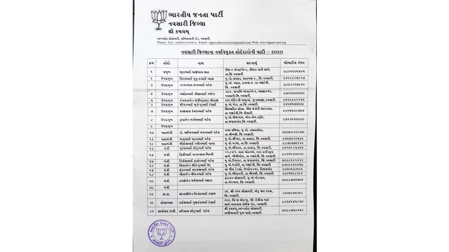 ભારતીય જનતા પાર્ટીના દક્ષિણ ગુજરાતના શહેર જિલ્લાઓના પદાધિકારીઓની યાદી ગુરુવારે જાહેર કરવામાં આવી હતી.