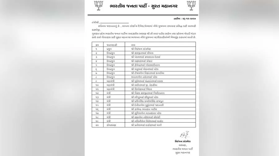ભારતીય જનતા પાર્ટીએ દિવાળી પહેલા સુરત શહેર અને જિલ્લા પ્રમુખના નામ જાહેર કર્યા હતા. તે પછી હવે ઉપપ્રમખ, મંત્રી અને ખજાનચીના નામની યાદી પણ જાહેર કરી દેવામાં આવી છે.સુરત શહેર-જિલ્લાના કેટલાંક જાણીતા ચહેરાના નામની અપેક્ષા રાખવામાં આવી હતી, પરંતું જે યાદી બહાર પડી છે તેમાં અનેક જાણીતા કાર્યકરોને પડતા મુકીને કેટલાંક નવા ચહેરાને સ્થાન આપવામાં આવ્યું છે.