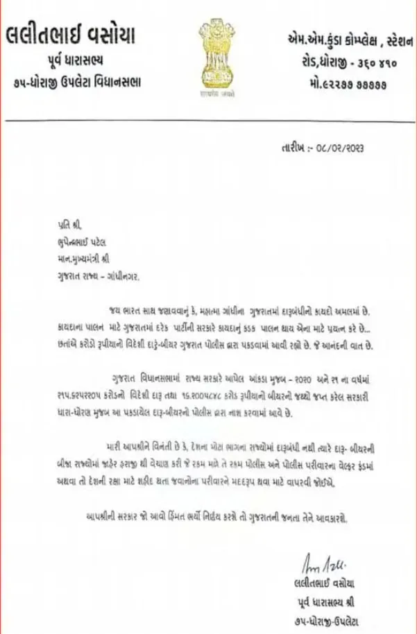 કોંગ્રેસના પૂર્વ ધારાસભ્ય લલિત વસોયાએ પત્રમાં લખ્યું છે કે ગુજરાતમાં દારૂબંધીનો કાયદો અમલમાં છે. કાયદાના પાલન માટે ગુજરાતમાં દરેક પાર્ટીની સરકાર કાયદાનું કડક પાલન થાય તેવા પ્રયાસ કરે છે. આમ છતા કરોડો રૂપિયાનો વિદેશી દારૂ અને બિયરની બોટલ પોલીસ પકડે છે. ગુજરાત વિધાનસભામાં સરકારે આપેલા આંકડા મુજબ વર્ષ 2020-21માં કુલ 215.62 કરોડ રૂપિયાનો વિદેશી દારૂ અને 16.20 કરોડ રૂપિયાનો બિયર જપ્ત કરવામાં આવ્યો હતો.