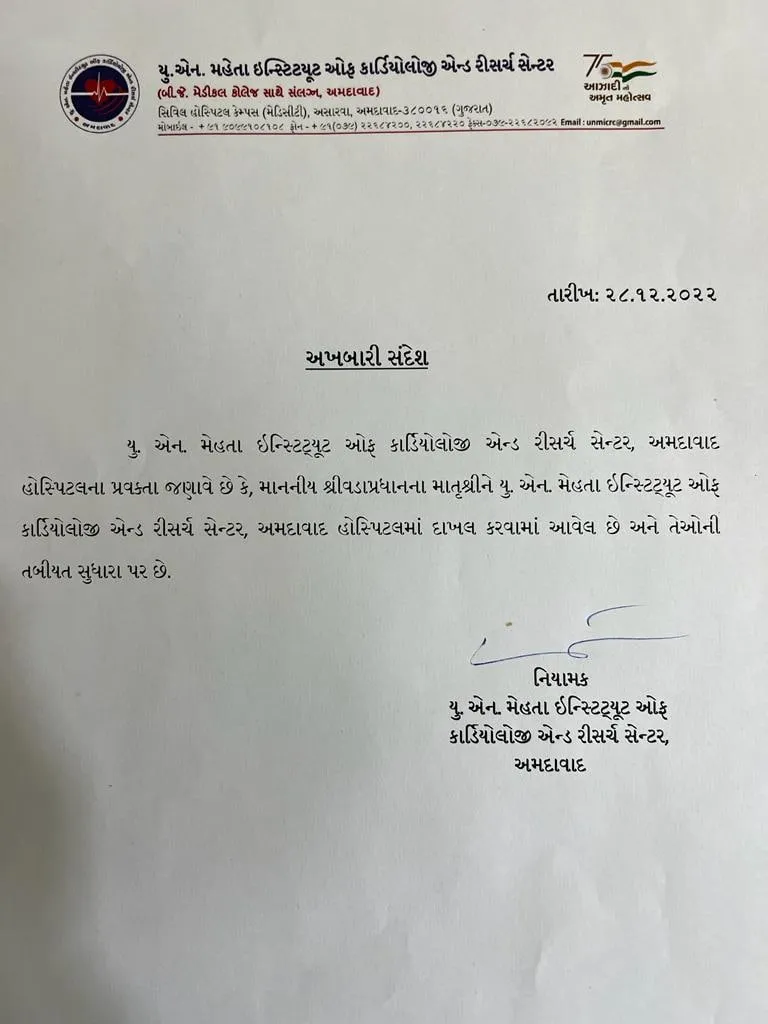 - PMના માતા હીરાબાને હોસ્પિટલમાં દાખલ કરાયા, યુ.એન.મહેતા હોસ્પિટલે આપ્યું અપડેટ