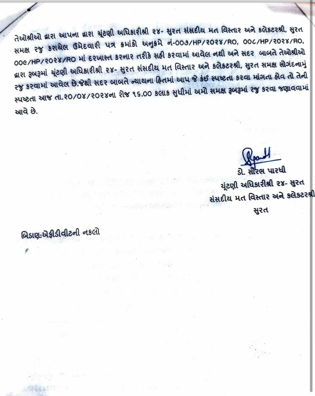 ભાજપ ઉમેદવારના ચૂંટણી એજન્ટ દિનેશ જોધાણીએ ફરિયાદ કરી હતી કે નિલેશ કુંભાણીના 3 ટેકેદારો જગદીશ સાવલિયા રમેશ પોલરા અને ધ્રુવીન ધામેલિયાએ મારી પાસે આવ્યા હતા અને કહ્યું હતું કે, નિલેશ કુંભાણીના આ 3 ટેકેદારોએ કહ્યું છે કે, ફોર્મમાં અમે સહી નથી કરી. એ પછી કલેકટર ઓફિસમાં ફરિયાદ કરવામાં આવી હતી.