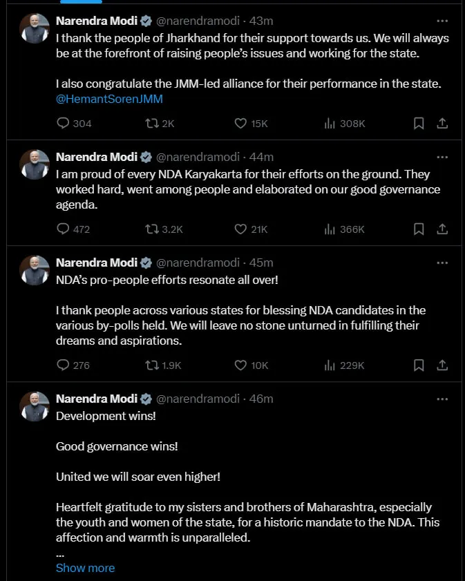 મહારાષ્ટ્રમાં જીત બાદ PM મોદીએ ટ્વીટ કરીને કહ્યું હતું કે, એકજુથ થઈને આપણે વધુ ઊંચી ઉડાન ભરીશું. NDAને ઐતિહાસિક જનાદેશ આપવા માટે મહારાષ્ટ્રના ભાઈઓ-બહેનો, ખાસ કરીને યુવાનો અને મહિલાઓનો દિલથી આભાર, હું લોકોને વિશ્વાસ અપાવું છું કે, અમારું ગઠબંધન મહારાષ્ટ્રની પ્રગતિ માટે કામ કરતું રહેશે.
