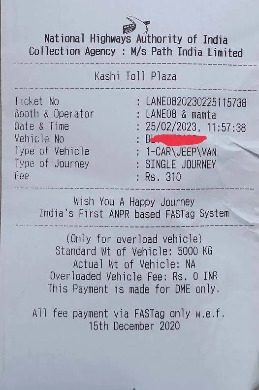 વપરાશકર્તા દ્વારા ફેસબુક પર શેર કરવામાં આવેલી, કાશી ટોલ પ્લાઝાની ટોલ સ્લિપ તારીખ 25 ફેબ્રુઆરી, 2023, સવારે 11:57 વાગ્યે છે, જેમાં એક જ વખતની મુસાફરી માટે 310 રૂપિયાની ફી લેવામાં આવી છે.