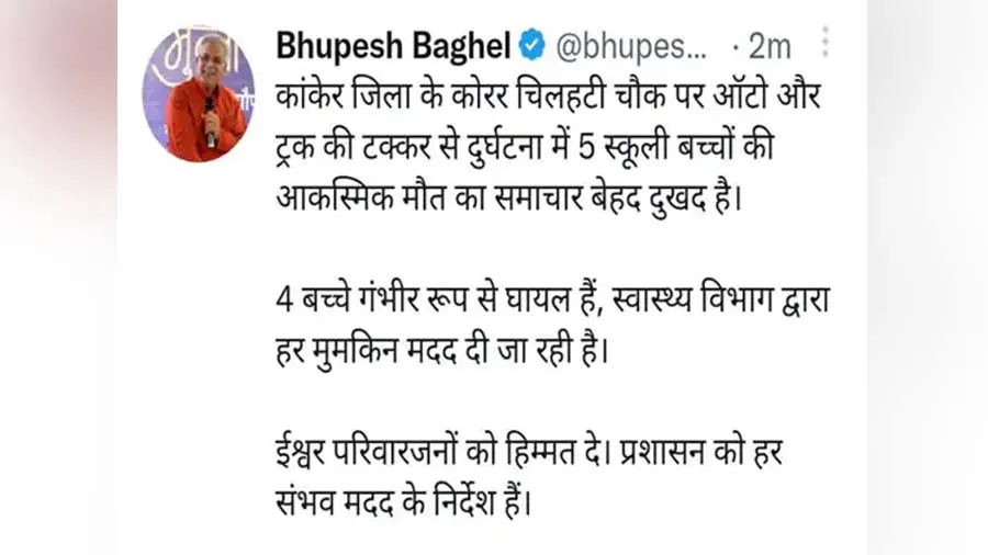 મુખ્યમંત્રી ભૂપેશ બઘેલે કાંકેરના કોરર ચિલહટી ચોક પર ઓટો અને ટ્રકની ટક્કરથી 7 સ્કૂલના બાળકોના આકસ્મિક મોત પર દુઃખ વ્યક્ત કરતા ટ્વીટ કર્યું છે. તેમણે લખ્યું કે, સમાચાર ખૂબ જ દુઃખદ છે. સ્વાસ્થ્ય વિભાગ દ્વારા દરેક શક્ય મદદ આપવામાં આવી રહી છે. ઈશ્વર પરિવારજનોને હિંમત આપે. પ્રશાસનને દરેક સંભવ મદદના નિર્દેશ આપવામાં આવ્યા છે. બાળકો બીએસએનએન ડિજિટલ પબ્લિક સ્કૂલમાં ભણતા હતા. તમામ બાળકોના પરિવારજનોને સૂચના આપી દેવામાં આવી છે. બાળકો પ્રાયમરી ધોરણમાં અભ્યાસ કરતા હતા. પોલીસ-પ્રશાસનના અધિકારી ઘટના સ્થળે પહોંચ્યા. કાંકેર એએસપી અવિનાશ ઠાકુરે જણાવ્યું કે, ટ્રક ભાનુપ્રતાપપુર તરફથી આવી રહી હતી. ટ્રક ડ્રાઇવર ફરાર છે, જેની શોધ કરવામાં આવી રહી છે, તેમજ ટ્રકને જપ્ત કરી લેવામાં આવી છે.