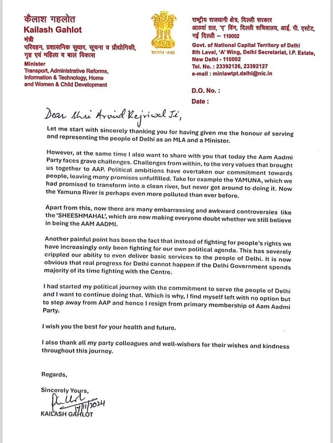 દિલ્હીમાં આમ આદમી પાર્ટીને મોટો ઝટકો લાગ્યો છે, તેમની પાર્ટીના વરિષ્ઠ નેતા અને મંત્રીએ પાર્ટીમાંથી રાજીનામું આપી દીધું છે. દિલ્હીના પરિવહન મંત્રી અને આમ આદમી પાર્ટીના દિગ્ગજ નેતા કૈલાશ ગેહલોતે આમ આદમી પાર્ટીના પ્રાથમિક સભ્યપદેથી રાજીનામું આપી દીધું છે. તેમણે રાજીનામું આપવાનું કારણ લોકોને આપેલા વચનો પૂરા ન કરવાનું જણાવ્યું છે. આ અંગે તેમણે પૂર્વ CM અરવિંદ કેજરીવાલને એક લેટર લખ્યો છે.