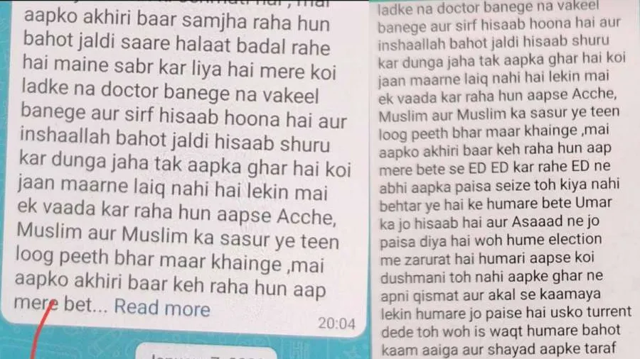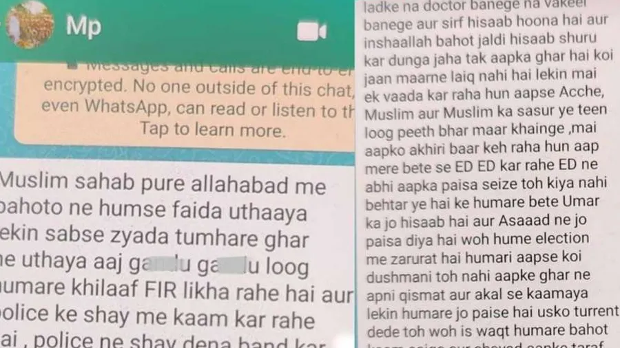 અતીક એહમદના વ્હોટ્સએપ મેસેજમાં લખ્યું, મુસ્લિમ સાહબ સમગ્ર ઇલાહાબાદમાં ઘણા બધાએ અમારો ફાયદો ઉઠાવ્યો પરંતુ, સૌથી વધુ તમારા ઘરે ઉઠાવ્યો. આજે તમારા જેવા ગ*#*- લોકો અમારી વિરુદ્ધ FIR કરાવી રહ્યા છે અને પોલીસની આડમાં કામ કરી રહ્યા છે. હું તમને છેલ્લીવાર સમજાવી રહ્યો છું, ખૂબ જ જલ્દી પરિસ્થિતિ બદલાઈ રહી છે. મેં શાંતિ રાખી લીધી છે. મારો કોઈ છોકરો ના ડૉક્ટર બનશે ના વકીલ બનશે અને માત્ર હિસાબ થવાનો છે અને ઇંશાઅલ્લાહ જ્યાં સુધી તમારું ઘર છે કોઈ જાનથી મારવાલાયક નથી. પરંતુ, હું એક વાયદો કરી રહ્યો છું તમને, અચ્છે, મુસ્લિમ અને મુસ્લિમના સસરા, આ ત્રણ લોકો પેટભરીને માર ખાશે.