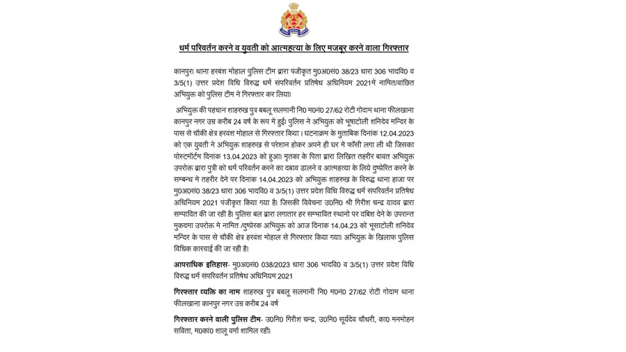ઉત્તર પ્રદેશના કાનપુર જિલ્લાના હરબંશમોહાલ વિસ્તારમાં એક યુવતીને કથિત રીતે આત્મહત્યા માટે ઉશ્કેરવાના આરોપમાં 24 વર્ષના શાહરૂખ નામના યુવકની ધરપકડ કરવામાં આવી છે. પોલીસે શનિવારે કહ્યું હતું કે, યુવતીએ ઇસ્લામ ધર્મ અંગીકાર કરવાનો ઇન્કાર કર્યો હતો, એ પછી શાહરૂખ તેણીને બદનામ કરવાની ધમકી આપતો હતો. પોલીસને કહેવા મુજબ પીડિત મહિલા આરોપી શાહરૂખ સાથે રિલેશીનશીપમાં હતી.