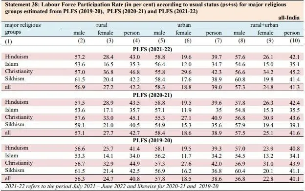 પીરિયડિક લેબર ફોર્સ સર્વે (PLFS)ના 2021-22ના અહેવાલ મુજબ, મુસ્લિમ મહિલાઓ માત્ર 15 ટકા અને હિંદુ મહિલાઓ 26 ટકા છે. PLFS (2020-21) વિશે વાત કરતાં, કામ કરતી મુસ્લિમ મહિલાઓની સંખ્યા 15.3 ટકા હોવાનું જણાવવામાં આવ્યું હતું. એટલે કે હવે સંખ્યામાં ઘટાડો થયો છે.