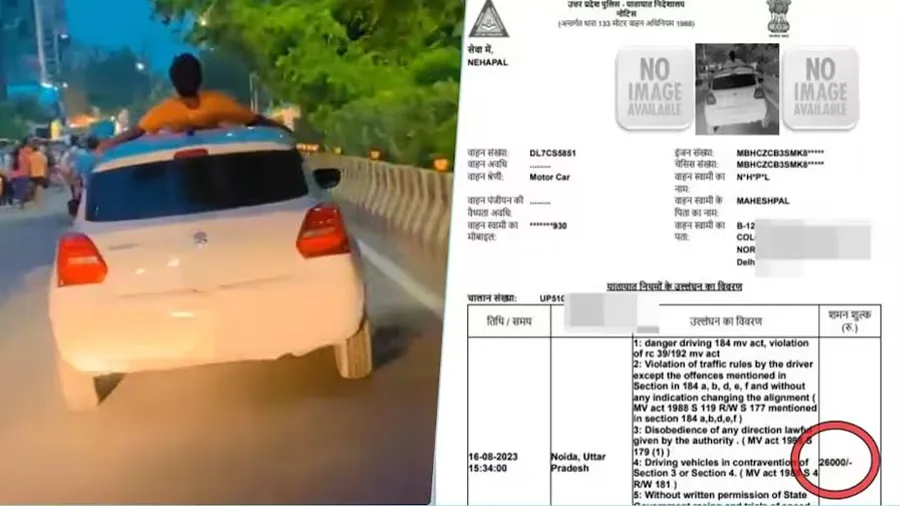 નોઇડાના સેક્ટર 18માં રસ્તા પર દોડી રહેલી એક કારનું સનરૂફ ખોલીને સ્ટંટ કરવાનું એક વ્યક્તિને ભારે પડી ગયું છે. પોલીસે કારના માલિકને 26,000 રૂપિયાનો દંડ ફટકારી દીધો છે.