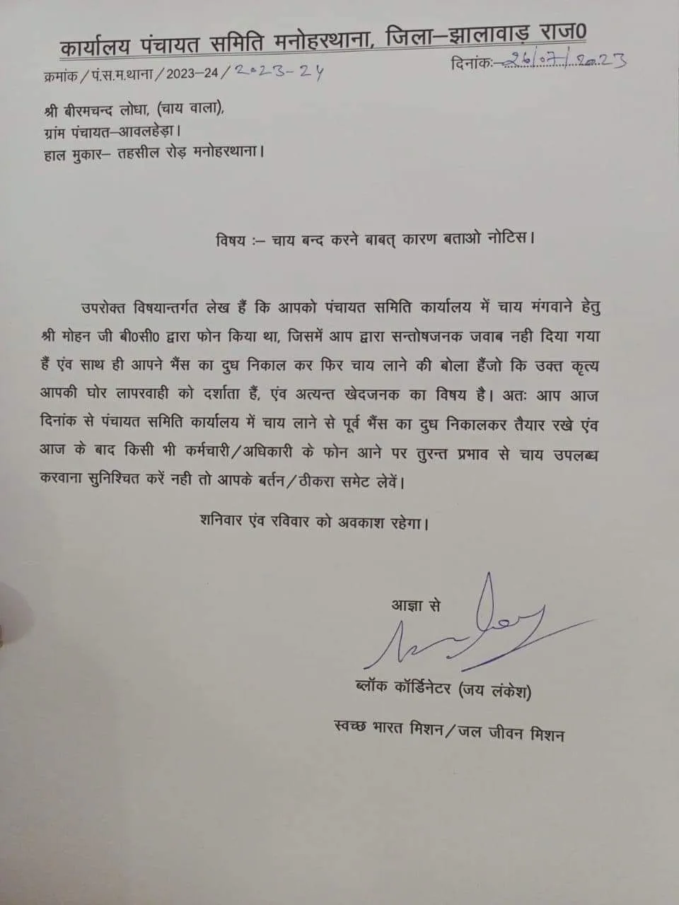 આ નોટિસમાં એમ લખવામાં આવ્યું હતું કે, 'B.C. મોહન દ્વારા પંચાયત સમિતિની ઓફિસમાં ચા મોકલવા માટે ફોન કરવામાં આવ્યો હતો. જેનો તમે સંતોષકારક જવાબ આપ્યો ન હતો. સાથે જ તમે કહ્યું હતું કે, ભેંસનું દૂધ કાઢીને પછી ચા લાવીશ. જે તમારી ઘોર બેદરકારી દર્શાવે છે. માટે હવેથી તમે ભેંસનું દૂધ કાઢીને તૈયાર રાખો અને ઓફિસના અધિકારી, કર્મચારી કહે કે તરત જ ચા લઈ પહોંચી જજો.'