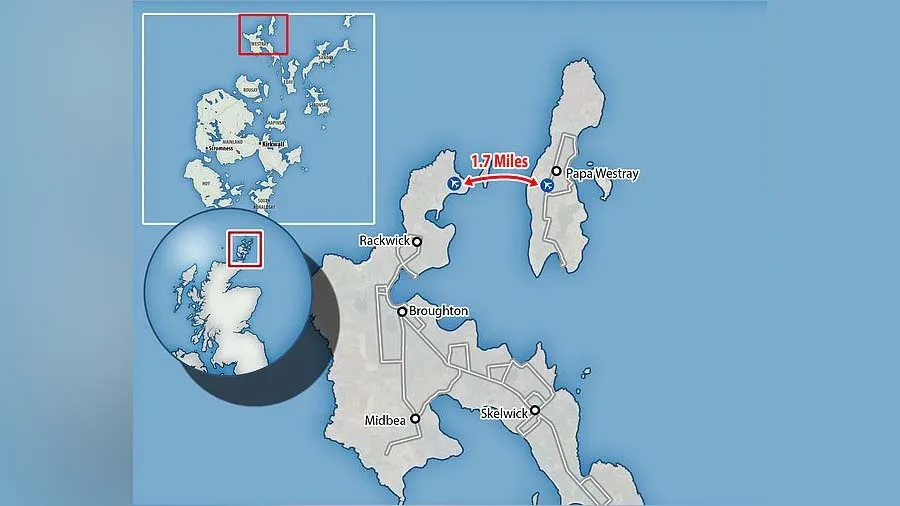 આ પ્રવાસ સ્કોટલેન્ડના બે ટાપૂઓ વચ્ચે હવાઈ માર્ગ દ્વારા નક્કી કરી શકાય છે. તેનું કારણ છે બંને ટાપૂઓની વચ્ચે કોઈ પુલનું ના હોવુ. સમુદ્રના રસ્તાનો વિકલ્પ પણ તમે વિચારી શકો છો. પરંતુ, તેની સાથે મુશ્કેલી એ છે કે સમુદ્રનો રસ્તો એટલો પથરાળ છે કે તે પાણી પર હોડીનું તરવુ શક્ય નથી. આથી, એક ટાપૂ પરથી બીજા ટાપૂ પર જવા માટે હવાઈ યાત્રા સિવાય બીજો કોઈ વિકલ્પ નથી અહીંના લોકો પાસે. આ ટાપૂઓના નામ છે વેસ્ટ્રે અને પાપા વેસ્ટ્રે. એક પર 600 તો બીજા ટાપૂ પર રહે છે કુલ 90 લોકો. આ યાત્રામાં ઉપયોગમાં લેનારી ફ્લાઈટને લોગાન એર ઓપરેટ કરે છે, જે છેલ્લાં 50 વર્ષોથી અહીં સર્વિસ આપી રહી છે.