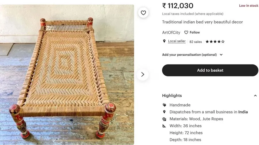 ઇટ્સીની વેબસાઇટનો સ્ક્રીનશોટ કોઇ યુઝરે સોશિયલ મીડિયા પર વાયરલ કર્યો છે. તેમાં લખ્યું છે કે, કિંમત વધારે હોવા છતાં લોકો હાથોહાથ તેને ખરીદી રહ્યા છે. કંપનીની વેબસાઇટ પર સ્ટોકમાં ફક્ત અમુક જ ચારપાઇ દેખાઇ રહી છે. અહીં લો ઇન સ્ટોકનો મેસેજ પણ આવી રહ્યો છે. જ્યારે, ડિસ્ક્રિપ્શનમાં લખ્યું છે કે, તેને ભારતના એક સ્મોલ બિઝનેસ તરફથી ડિસ્પેચ કરવામાં આવી રહી છે. આ લાકડી, જ્યૂટની દોરીથી બને છે. જેની પહોડાઇ 36 ઇંચ એટલે કે, લગભગ 3 ફૂટ છે અને લંબાઇ 72 ઇંચ એટલે કે, 6 ફૂટ છે અને ઉંચાઇ 18 ઇંચ એટલે કે, 2 ફૂટ છે.