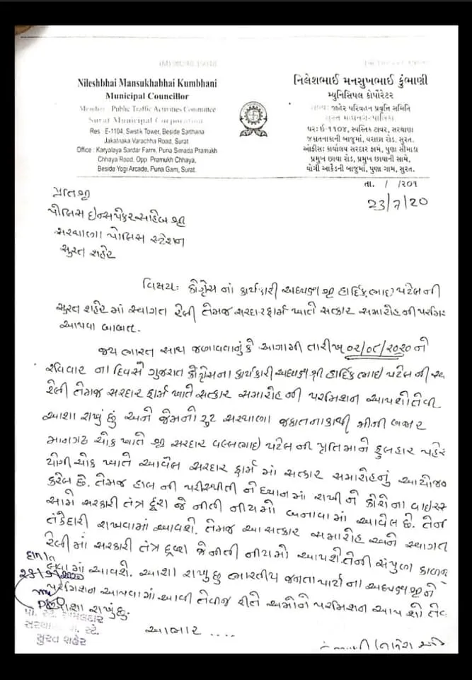 કોંગ્રેસના કાર્યકારી અધ્યક્ષ હાર્દિક પટેલના સત્કાર માટે રેલી તેમજ સમારંભ માટે પરવાનગી માગતા સુરતના કોંગ્રેસના કોર્પોરેટર નિલેશ કુંભાણી દ્વારા પરવાનગી માગતો સરથાણા પોલીસ PIને જે પત્ર લખવામાં આવ્યો છે, તેમાં તેમણે જણાવ્યું છે કે, આગામી તારીખ 2/8/2020ને રવિવારના દિવસે ગુજરાતના કોંગ્રેસના કાર્યકારી અધ્યક્ષ શ્રી હાર્દિક પટેલની રેલી તેમજ સરદાર ફાર્મ ખાતે સત્કાર સમારોહની પરમિશન આપશો તેવી આશા રાખુ છું અને જેનો રૂટ સરથાણા જકાતનાકાથી મીની બજાર માનગઢ ચોક ખાતે આવેલ સરદાર ફાર્મમાં સત્કાર સમારોહનું આયોજન કરેલ છે.