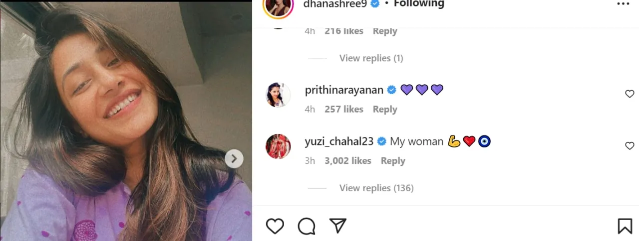 આ પોસ્ટ પર યુઝવેન્દ્ર ચહલે કમેન્ટ કરીને ધનશ્રીને સપોર્ટ કર્યો હતો. ચહલે કમેન્ટમાં 'માય વુમન' લખ્યું હતું.
