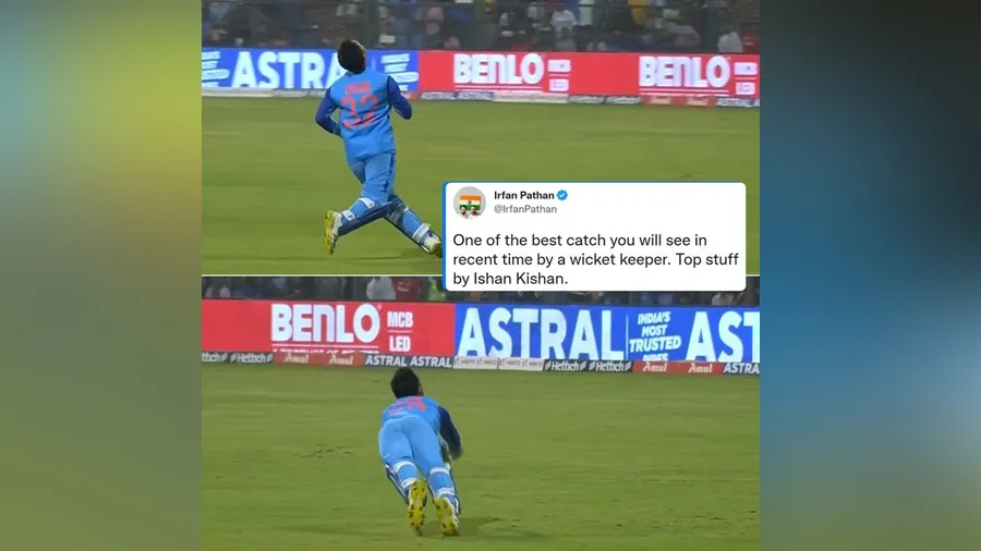 ઈશાન કિશના આ કમાલના કેચના દરેક લોકો વખાણ કરી રહ્યા છે. પૂર્વ ભારતીય ક્રિકેટર ઈરફાન પઠાણે ટ્વીટ કરીને કહ્યું છે કે હાલના દિવસોમાં કોઈ વિકેટકીપર દ્વારા લેવામાં આવેલો સૌથી સારો કેચ. શાનદાર ફિલ્ડીંગ સિવાય ઈશાન કિશને વિસ્ફોટક બેટિંગમાં પણ પોતાનું યોદગાન આપ્યું છે. ભારતીય ટીમની શરૂઆત ઘણી ખરાબ રહી હતી.