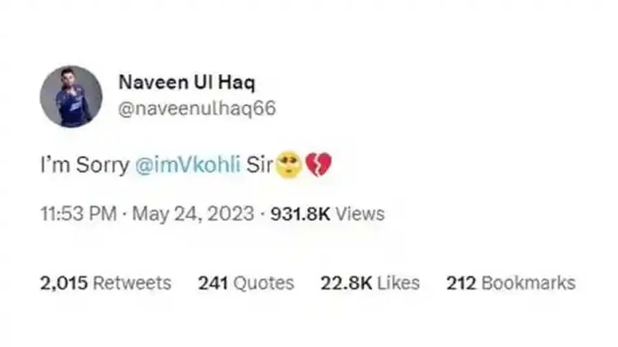 લખનૌ સુપર જાયન્ટ્સ (LSG)ની ઇન્ડિયન પ્રીમિયર લીગ (IPL)ની સફર એલિમિનેટર મેચ સુધી જ હતી. લખનૌ સુપર જાયન્ટ્સને એલિમિનેટર મેચમાં મુંબઈ ઇન્ડિયન્સ (MI)ના હાથે નિરાશાજનક હારનો સામનો કરવો પડ્યો. અફઘાની ફાસ્ટ બોલર નવીન ઉલ હકે લખનૌ સુપર જાયન્ટ્સ માટે શાનદાર પ્રદર્શન કર્યું હતું, પરંતુ તેના પર પાણી ફરી વળ્યું. નવીન ઉલ હકે 4 વિકેટ લીધી હતી. 24 મેના રોજ આ મેચ પૂરી થયા બાદ નવીન ઉલ હકના નામથી એક ટ્વીટ ખૂબ વાયરલ થઈ હતી, જેમાં “આઈ એમ સોરી વિરાટ કોહલી સર” એવું લખ્યું હતું.
