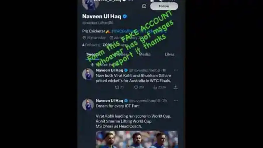 જો કે, નવીન ઉલ હક નામથી જ્યારે સોરી કોહલી કમેન્ટ અને એક અન્ય પોસ્ટની ખૂબ ચર્ચા થઈ તો અફઘાની બોલરના કાન ઊભા થઈ ગયા. નવીન ઉલ હકે તેના પર સ્પષ્ટતા આપી છે. તેણે કહ્યું કે, @naveenulhaq66 નામનું ટ્વીટર હેન્ડલ નકલી છે. તેણે શનિવારે ઇન્સ્ટા સ્ટોરી પર ફેન્સને આગ્રહ કર્યો કે જો કોઈને આ અકાઉન્ટથી મેસેજ મળે છે તો રિપોર્ટ કરો. આમ તો હવે આ એકાઉન્ટને ટ્વીટરે સસ્પેન્ડ કરી દીધું છે. નવીન ઉલ હકની જ્યારે વિરાટ કોહલી સાથે બોલાબોલી થઈ તો ત્યારબાદથી જ અફઘાની ખેલાડીને સ્ટેડિમમાં ઘણા દર્શકોએ આડે હાથ લીધો હતો.