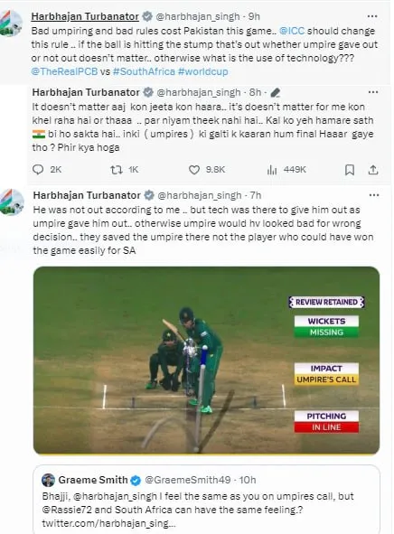 હરભજન સિંહ આ મેચમાં ખરાબ અમ્પાયરિંગને લઇ ભડકી ગયો. તેણે ICCને ટેગ કરતા લખ્યું કે, ખરાબ અમ્પાયરિંગ અને નિયમોને કારણે પાકિસ્તાને આ મેચ ગુમાવવી પડી. આ નિયમને બદલવા જોઇએ. જો બોલ સ્ટંપ પર લાગી રહી છે તો આઉટ છે. અમ્પાયરે આઉટ આપ્યો કે નોટઆઉટ તેનાથી ફરક પડતો નથી. નહીંતર ટેક્નોલોજીનો શું ફાયદો?