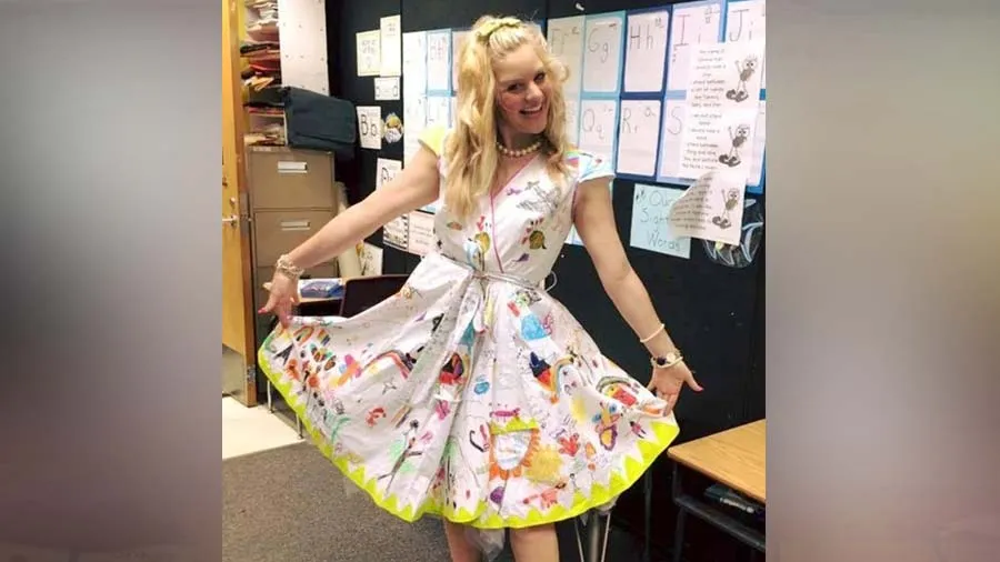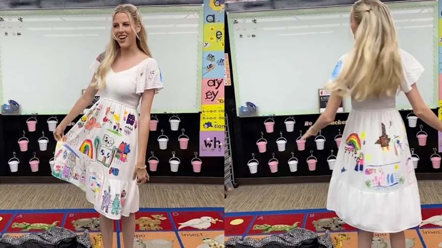 પરંતુ તાજેતરમાં એક મહિલા શિક્ષકે તેના વિદ્યાર્થીઓને તેમના શાળાના છેલ્લા દિવસે સરપ્રાઈઝ આપી હતી. જ્યારે તેણે હિથર સ્ટેન્સબેરી નામના ઇન્સ્ટાગ્રામ એકાઉન્ટ પર આ વિશે શેર કર્યું, ત્યારે લોકોએ તેના વખાણ કરવાનું શરૂ કર્યું. હીથર શાળામાં તેના છેલ્લા દિવસે ઓવરકોટ પહેરીને ક્લાસમાં જાય છે. પરંતુ તેણે જેવો પોતાનો ઓવરકોટ હટાવ્યો કે તરત જ તેના વિદ્યાર્થીઓને આશ્ચર્ય થયું. આનું કારણ હિથરનો સફેદ ડ્રેસ હતો, જેમાં તેના તમામ વિદ્યાર્થીઓની એક ખાસ નિશાની હતી.
