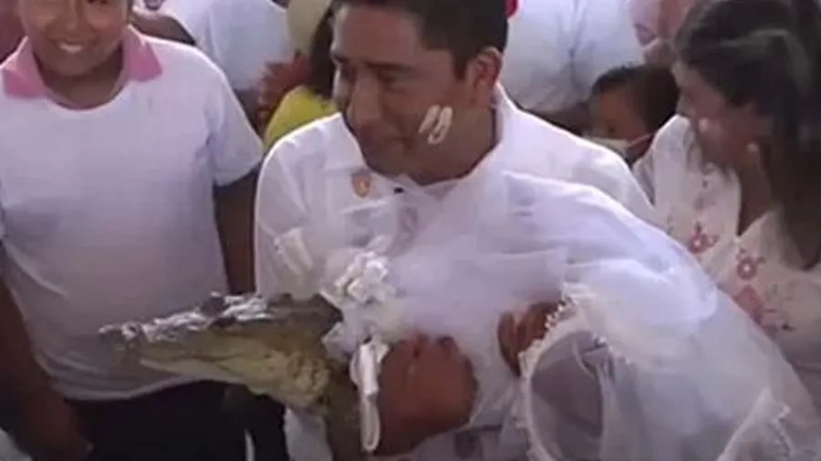 આપણા દેશમાં દેડકા અને કૂતરાના લગ્નના સમાચારો આવે છે, પરંતુ આ વખતે મગર સાથે લગ્ન કરવાનો મામલો સામે આવ્યો છે. રસપ્રદ વાત એ છે કે મગર સિવાય અન્ય કોઈએ અહીંના મેયર સાથે લગ્ન કર્યા નથી. મેક્સિકોમાંથી એક ચોંકાવનારા સમાચાર સામે આવ્યા છે. હકીકતમાં, સેન પેડ્રો હ્યુઆમેલુલા શહેરના મેયર વિક્ટર હ્યુગો સોસાએ પરંપરાગત સમારંભમાં માદા મગર સાથે લગ્ન કર્યા હતા. જૂની પરંપરા મુજબ આમ કરવાથી સૌભાગ્ય પ્રાપ્ત થાય છે. અત્રે ઉલ્લેખનીય છે કે, સ્થાનિક ઇતિહાસમાં મગરને રાજકુમારી છોકરી તરીકે જોવામાં આવે છે.